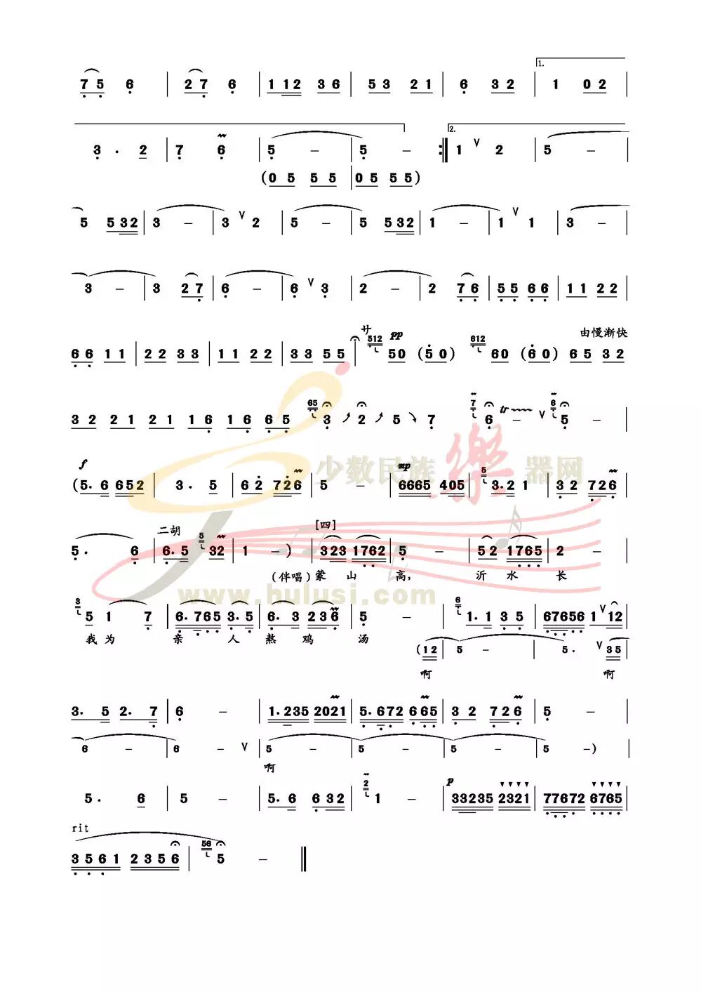 C乐段:有42小节,欢跃,支前场景,突显一种乐观的抗敌精神,充分表现沂蒙红嫂的大美!20小节反复一遍,42小节后巧妙地融入散板,自由地由慢渐快诉述……!