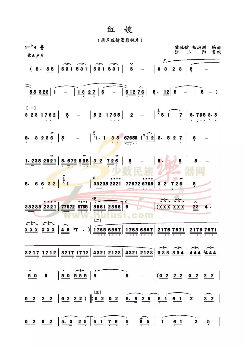 本曲为多段体曲式结构,2/4拍/分,用降B调葫芦丝演奏;共分四段A+B+C+DA′有108小节;前奏以一首嘹亮的冲锋号!硝烟弥漫的战场!鼓舞斗志勇往直前,展现出沂蒙山的黎明!