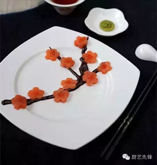 5、把花朵形的三文鱼放在巧克力树枝上,再把鱼子放在三文鱼上;