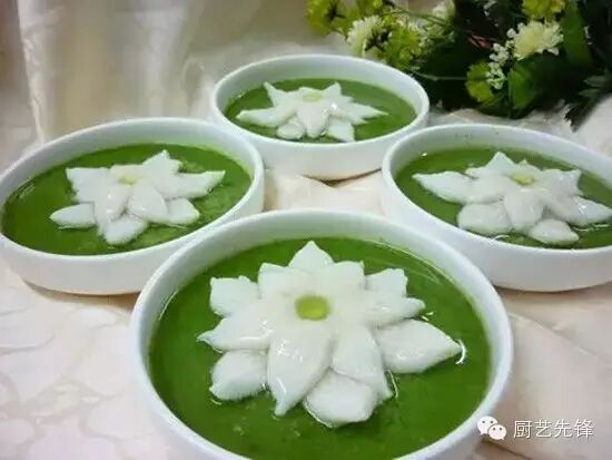 3、把鱼茸装入裱花袋,在小盘中挤出荷花的花瓣,第一层挤六片,第二层再挤六片小一点的花瓣,中间放一片菜薹点缀花心。把做好的荷花慢慢滑入水盆中,开小火汆熟;