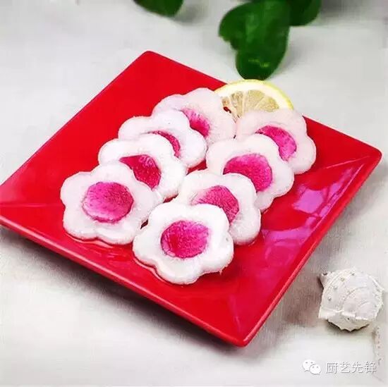 1、白萝卜洗净,切成大片,用花型模切成花;