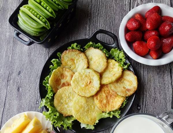 4. 起锅热少许油,西葫芦片裹上蛋液煎至两面金黄即可