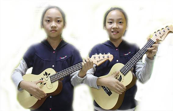 ↑胡*菁、胡*菲 参演节目:尤克里里合奏:《新年好》