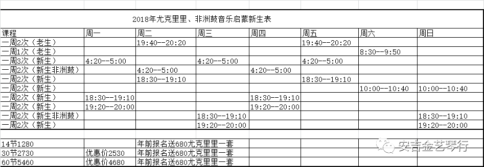 快乐非洲鼓、 | 启蒙班 | 4~10 | 小班化 每周2次或3次 | 40-60分钟 | 报名后统一安排上课 (看上面具体时间安排) (新嘉园) |