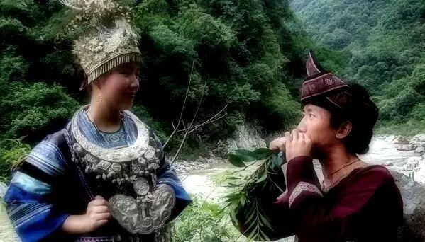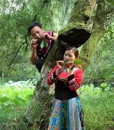 游方坡上,歌声脆喽,摘片木叶吹起歌,一片木叶哟,一片情喽,声声绕着山寨飞咦哟,小伙子吹得心花放,姑娘嘞听了来相会,阿哥嘞阿妹情意深,吹响木叶不用媒。