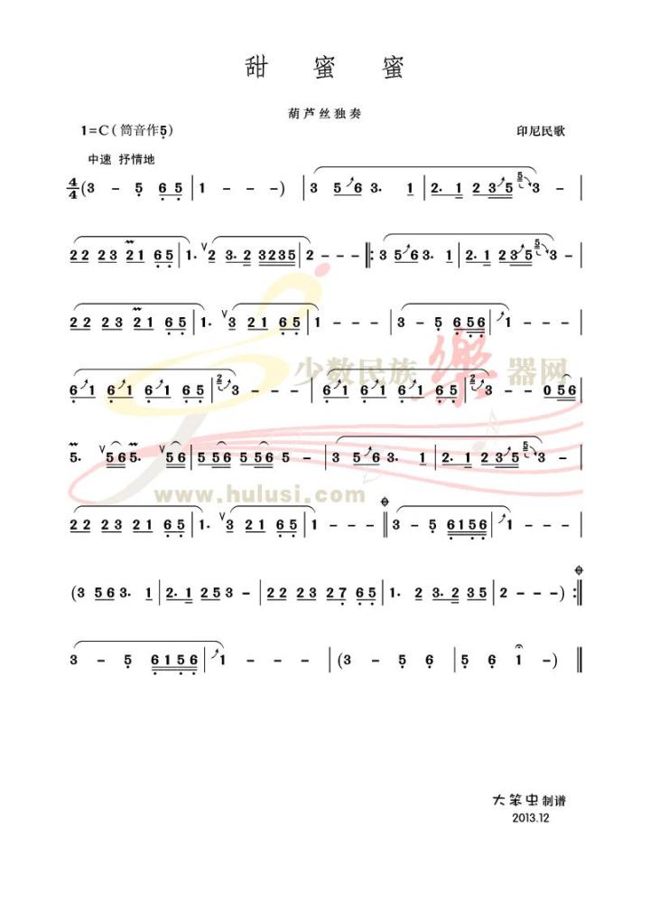《甜蜜蜜》永远的经典,用葫芦丝独奏,别有一番韵味,演奏技巧主要是倚音、滑音、波音、颤音,乐曲和气息配合主要体现在在第七行第二小节至第八行第三小节,前边以滑音体现一种思索,要黏糊,后面体现一种醒悟,要欢快清晰。