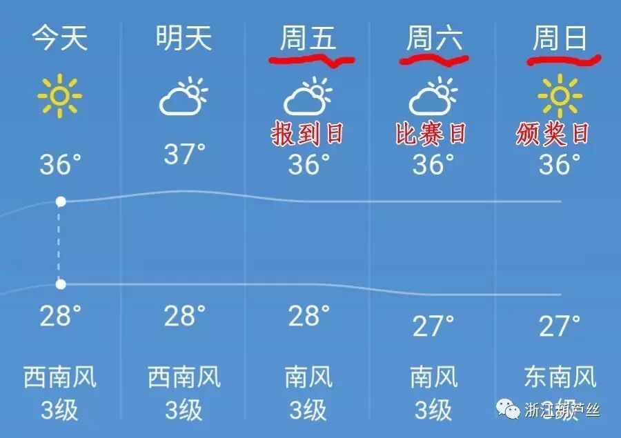 还有一点也非常重要,小编实在忍不住要提醒大家,这几天杭州已经入伏了,气温较高,请大家做好防暑降温工作,确保以最佳的状态参加比赛,拿到自己理想的成绩哦!发出比赛期间的杭州天气供大家参考。