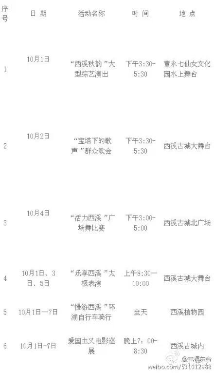 2、10月1日,东台市西溪景区国庆黄金周系列活动正式拉开序幕。上午,太极爱好者在西溪古城晏溪书院进行太极表演。下午三点半,西溪景区水上舞台举办“西溪秋韵”大型综艺演出。七仙女导游团亮相演出现场。10月1日-7日每晚7:00,西溪古城大舞台放映优秀国产影片。