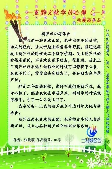 张峻硕同学开门见山地简单介绍自己对葫芦丝的基本认识和自己对葫芦丝喜欢的原因。看到葫芦丝能给同学带来如此大的改变----葫芦丝的学习让他能够静下心,改变自己暴躁和不喜欢交朋友的习惯。通过他如此直接的表达,我们相信这是他的真是感受。既然葫芦丝的学习,能带给同学如此大的提升,这是一支韵文化老师最应该感到欣慰的。