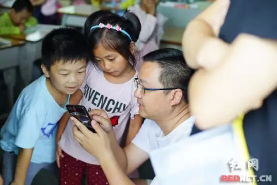 志愿者邹捷是一名活动导演,他用手机录制孩子们的视频,并与他们一起分享。同学们很喜欢邹捷送的“礼物”,他们拽着邹老师要“再来一个”。