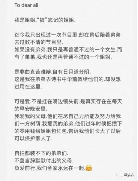 而姐姐似乎是这个家的隐形人,甚至上节目的时候放出的大合照,都没有姐姐蒋娜的身影。