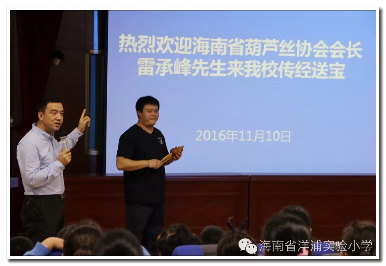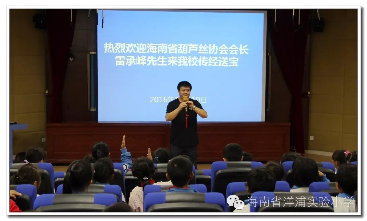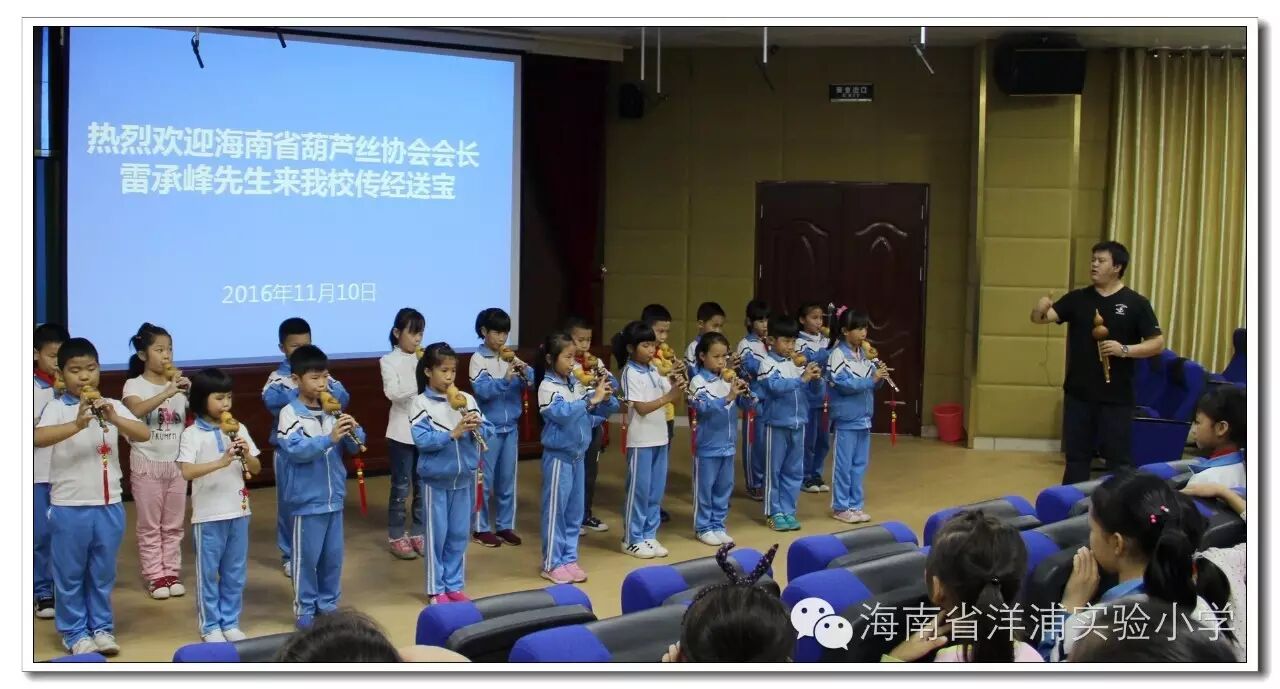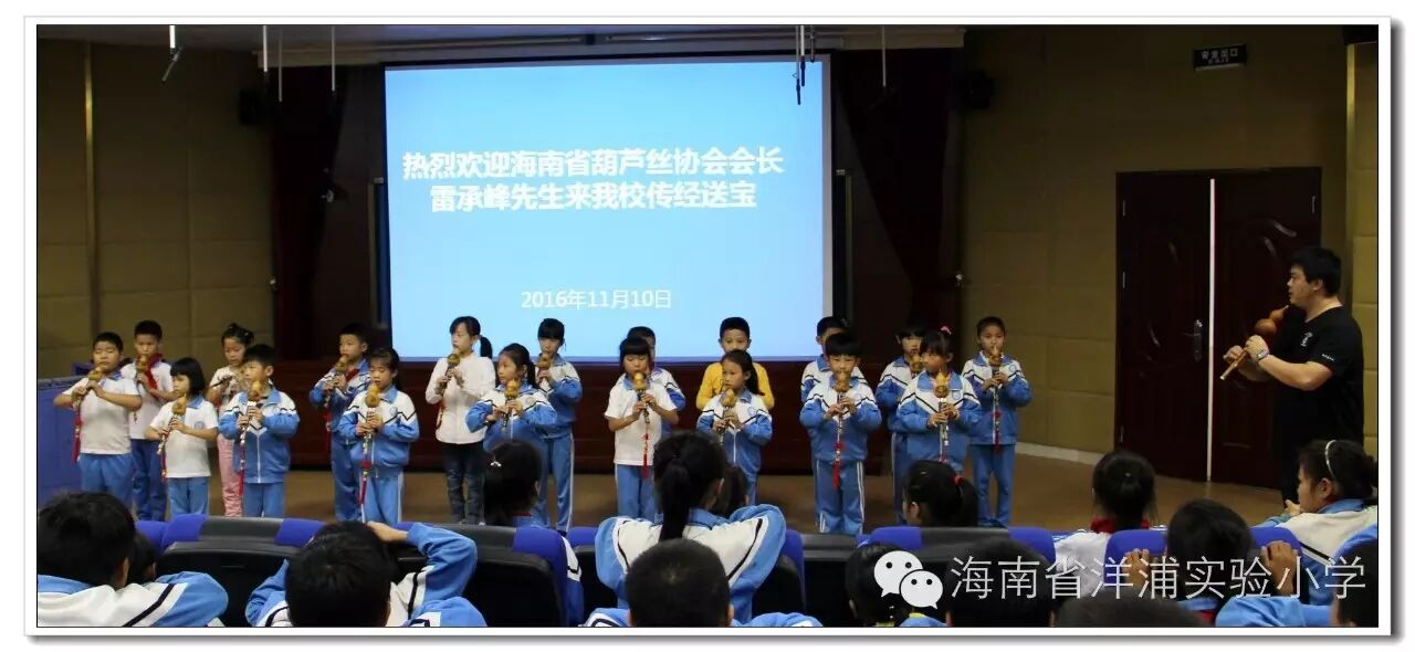 窗外细雨蒙蒙,室内葫音绵绵。11月10日下午,海南省葫芦丝协会会长雷承峰先生来我校为校本课程“海之韵——葫芦丝”班的学生上课。任斌强校长代表学校全体师生对雷承峰先生的到来表示欢迎。,因他高超的演奏水平,曾应邀到世界著名大学——英国剑桥大学、牛津大学演出,受到国际友人的高度好评。