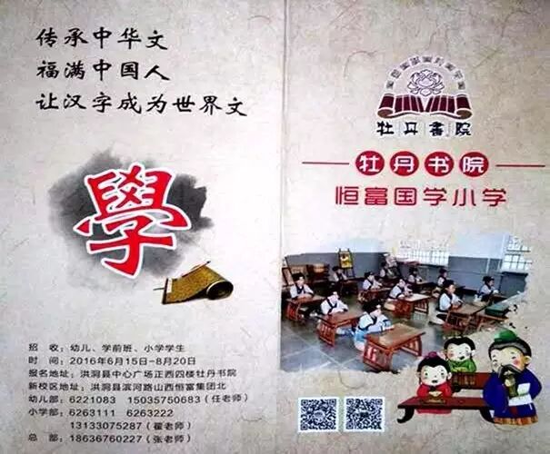 【牡丹书院-恒富国学小学】位于洪洞县滨河路山西恒富集团北,是晋南地区唯一一所全日制国学小学。 牡丹书院将对各幼儿园进行“传承中华文、实现中国梦”公益讲座,各加盟园速与培训部老师取得联系,安排讲座时间,并申请由山西恒富集团提供的公益助学金名额。 特困生资助:山西恒富集团资助牡丹书院恒富国学小学公益助学金(符合贫困资助条件的学生优先录取)