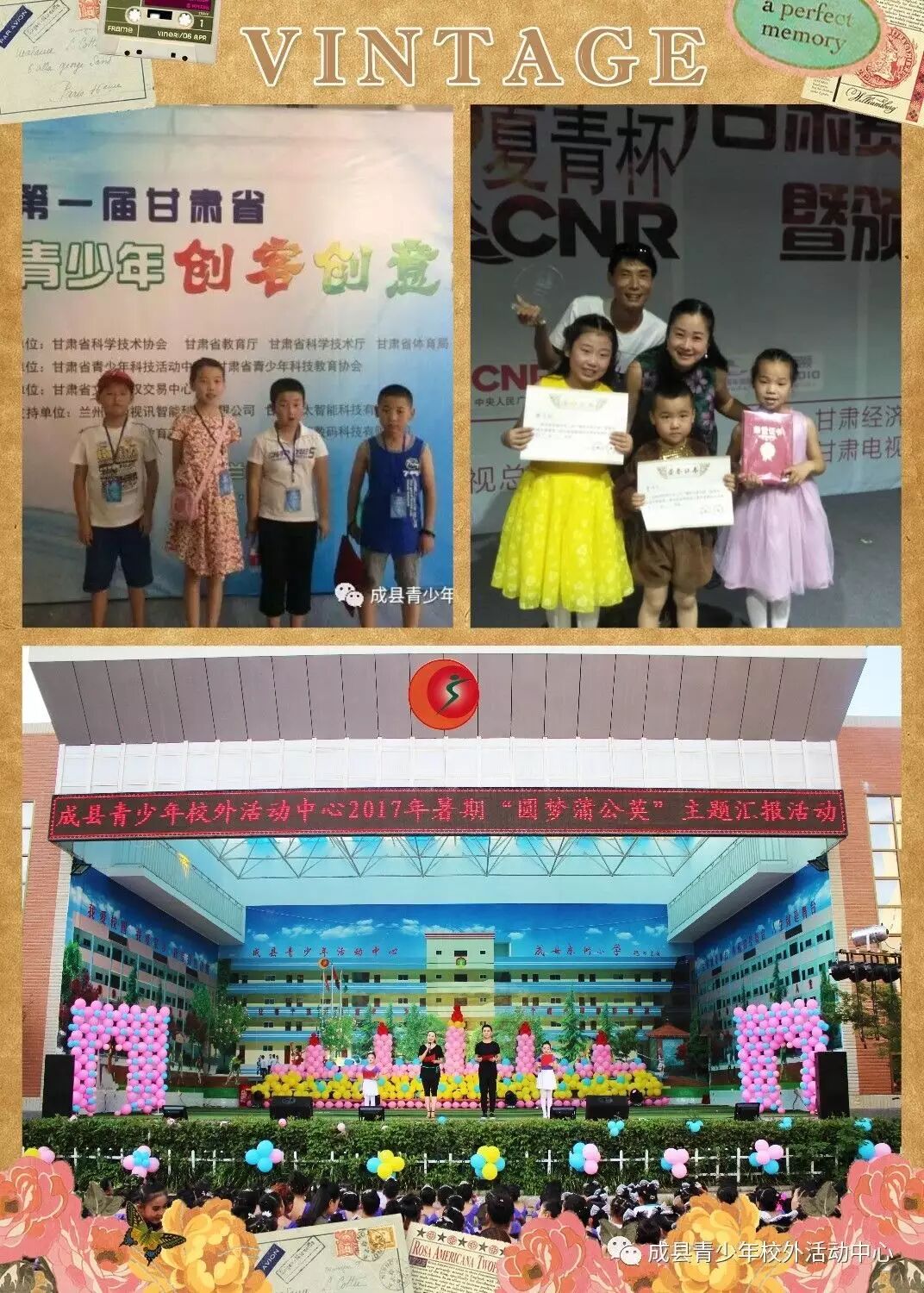 成县青少年校外活动中心是我县唯一一所公办的青少年校外教育机构,隶属于成县教育局,与学校教育、家庭教育一起构成了我县未成年人教育体系。2013年被市教育局评为“陇南市艺术教育先进单位”,被甘肃省教育厅命名为“全省优秀青少年校外活动中心”。被中国舞蹈家协会授予“中小学舞蹈教育传统校”,是中国儿童歌舞学会团体会员单位,被《青少年书法报》确定为成县青少年书法培训基地,是成县关工委确立的成县关心教育下一代基地,中国歌剧舞剧院授予的陇南考级点,中国美术学院授予的美术考级点,甘肃省招考办批复的剑桥少儿英语考级点。