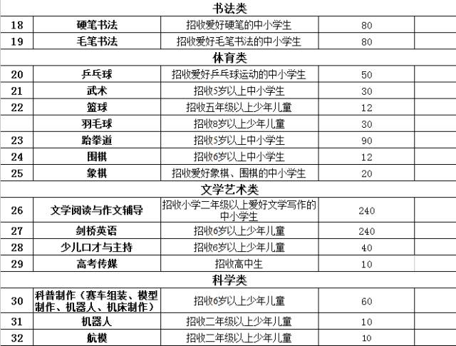 DIY创意手工(30人)、科普(60人)、大提琴(15人)、小提琴(20人),萨克斯(限20人)、羽毛球(30人)、中学生声乐(35人)。