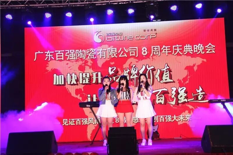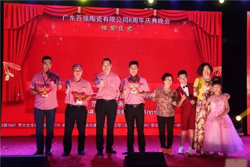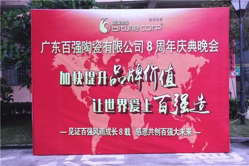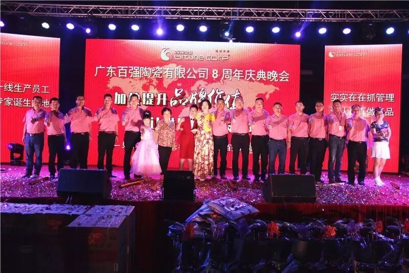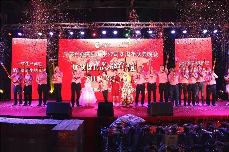 加快提升品牌价值,让世界爱上百强造。2017年5月20日,广东省著名商标安基陶瓷生产基地-广东百强陶瓷有限公司迎来了8周岁的生日,庆典晚宴当日,宾客满门,高朋满座。集团董事长何汝其先生携夫人张秀容、儿子何盛发、女儿何晓欣与集团销售总经理刘雪芹、百强一厂生产副总经理黄文广、百强二厂生产副总经理陈华生以及百强企业所有员工和恩平市各级政府代表共3000多人一同见证此次盛会,共同分享了百强陶瓷8周年生日的喜悦。