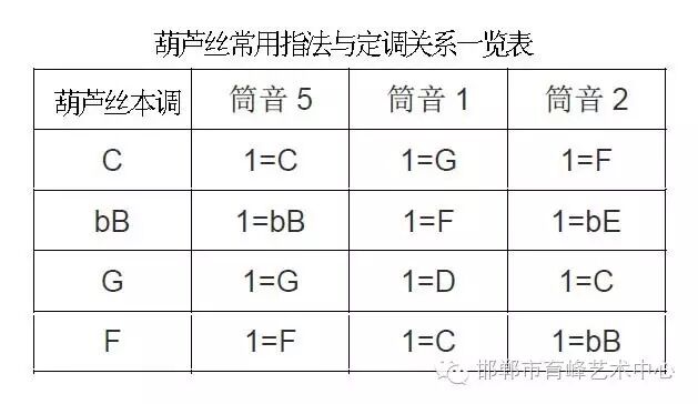 G调的葫芦丝以筒音作5,则吹出的乐曲是G调;若以筒音作1,则吹出的乐曲为D调;而若以筒音作2,则吹出的乐曲为降C调。