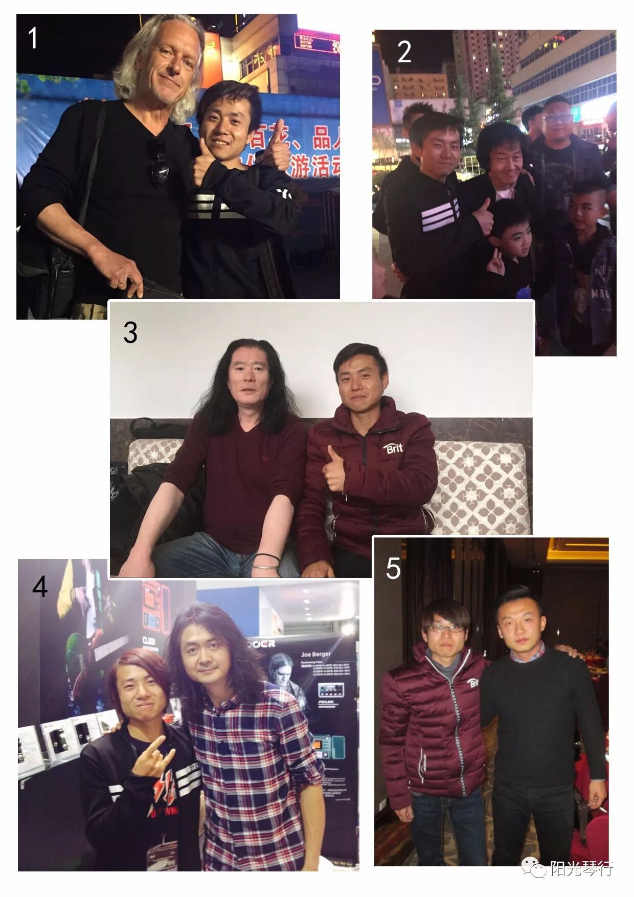 注释:1、阳光琴行马老师与荷兰国宝级爵士鼓大师卢卡斯合影;2、西北鼓王赵牧阳老师与琴行马老师在活动现场;3、左边是“唐朝乐队”鼓手赵年老师,右边是琴行马老师;4、阳光琴行马老师与“唐朝乐队“吉他手陈磊老师在上海;5、“低苦艾”乐队鼓手窦涛与马老师。