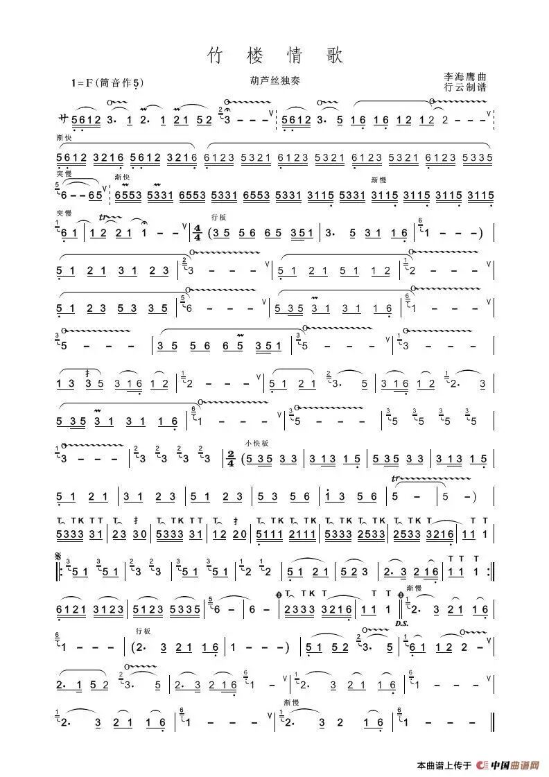 《竹楼情歌》曲作者 李海鹰1954年生于广州。他从小喜欢音乐,很早就开始显露音乐才华。1970年,他才16岁就进入广州粤剧团,当上了小提琴手兼创作员。5年以后,他成为中国海军南海舰队文工团的小提琴手兼创作员。这期间,他被送到广州星海音乐学院作曲进修班学习了一年半。1982 年底到1997年3月,他在广东音乐曲艺团当创作员,《弯弯的月亮》就是这期间写出来的。从1997年4月起,他担任了广东电视台的音乐总监。 《竹楼情歌》是一首广为流传的葫芦丝、巴乌独奏曲。