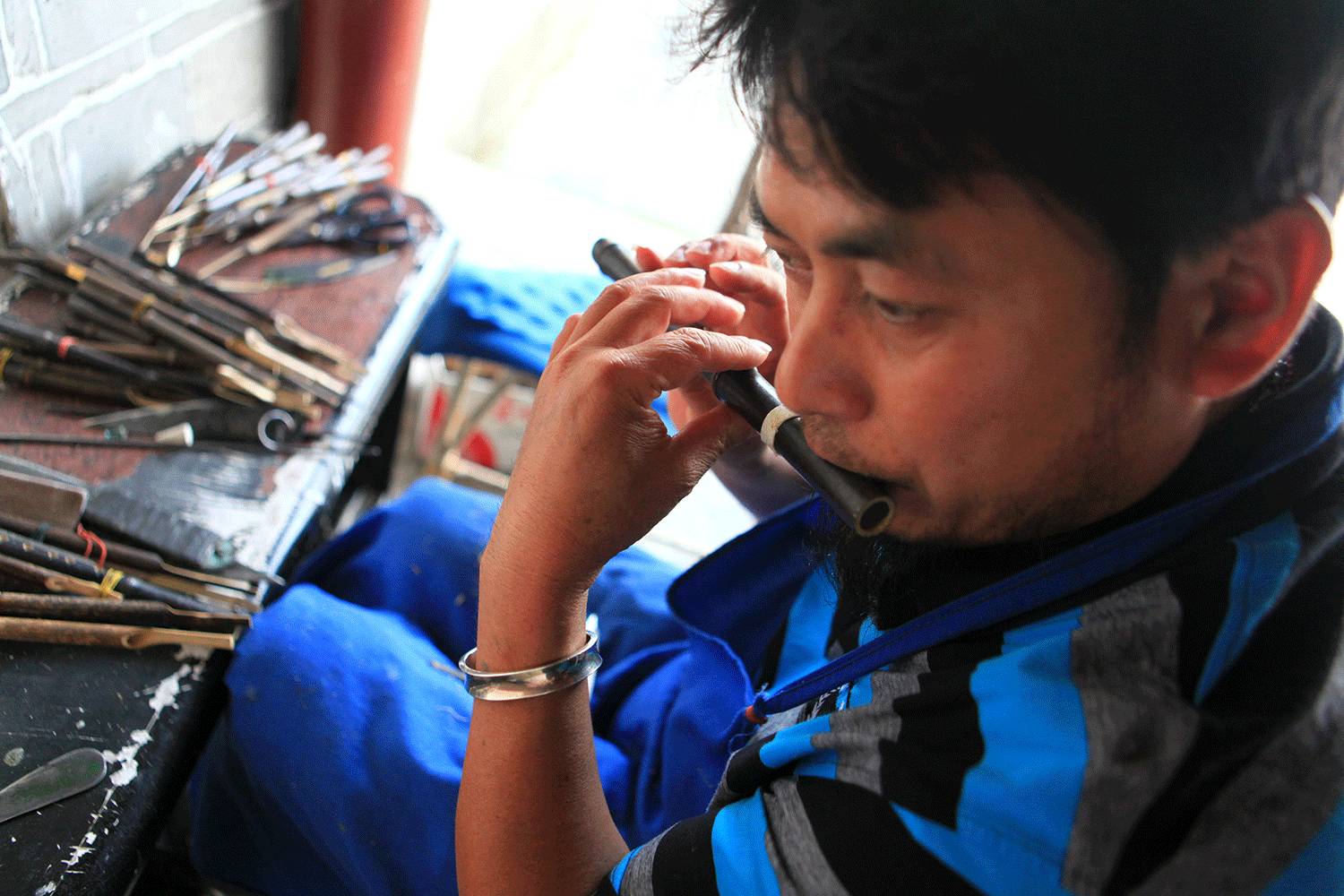 杜德光中等个头,蓄着大胡子,腰绕围巾。在店铺门前的小长桌前,他先把昨天妻子安装好的葫芦丝拆开,分离出主管,后用嘴将整个都覆住,吹响主管。手指快速弹奏,耳朵敏锐地抓住发出的这些音符,并判断它们高低是否准确。