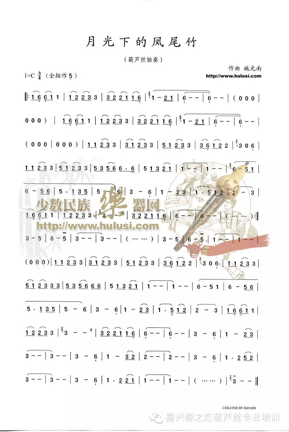 《月光下的凤尾竹》是一首著名的傣族乐曲,以其悠扬的曲调、娓娓动听的旋律,给人心旷神怡的感觉。让人不由联想起那郁郁葱葱的凤尾竹林,别具一格的傣家楼阁撒落在竹林间,有如天上的星子,依山傍水,在融融的月光下,竹林中隐隐飘出的阵阵葫芦丝,幽攸抑扬,轻清淡雅。作词:倪维德,作曲:施光南,以葫芦丝演奏的版本最为常见;后燕妮、关牧村等也演唱过该曲目的歌唱版本。 其他乐器也有过演奏。附曲谱:欢迎关注‘春之恋’葫芦丝并分享!