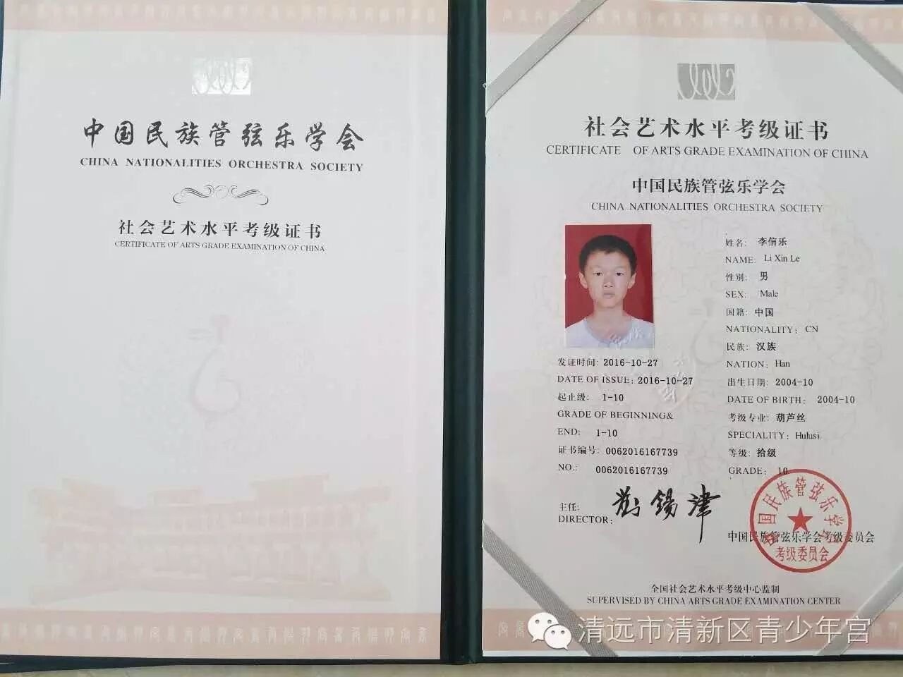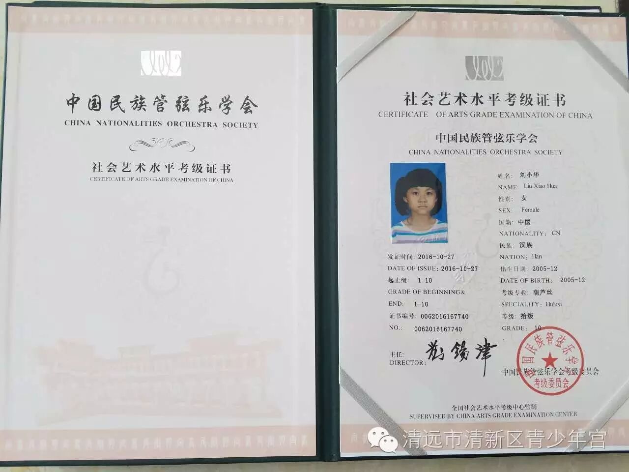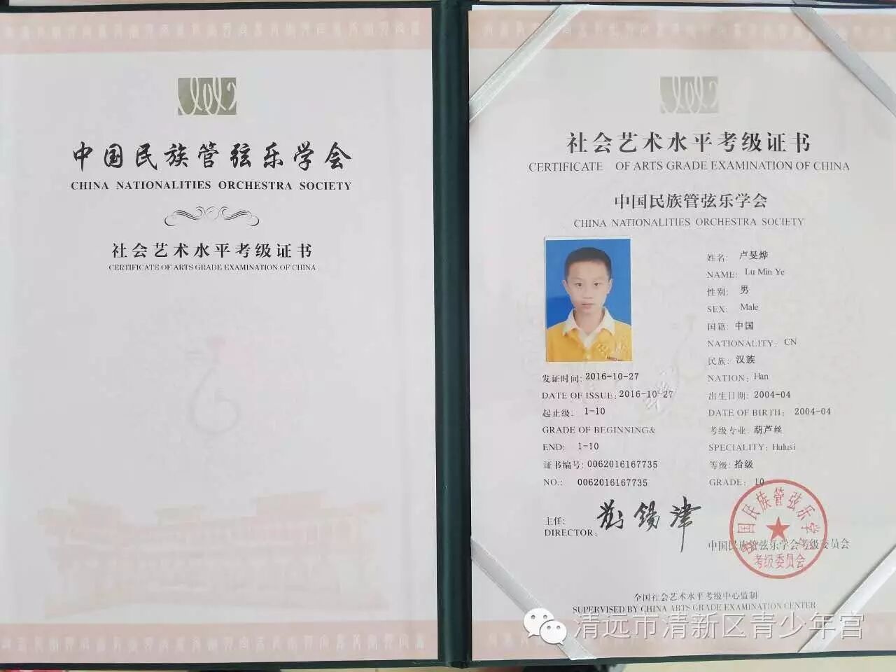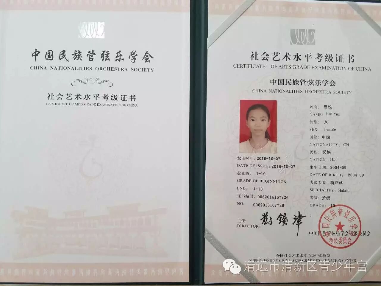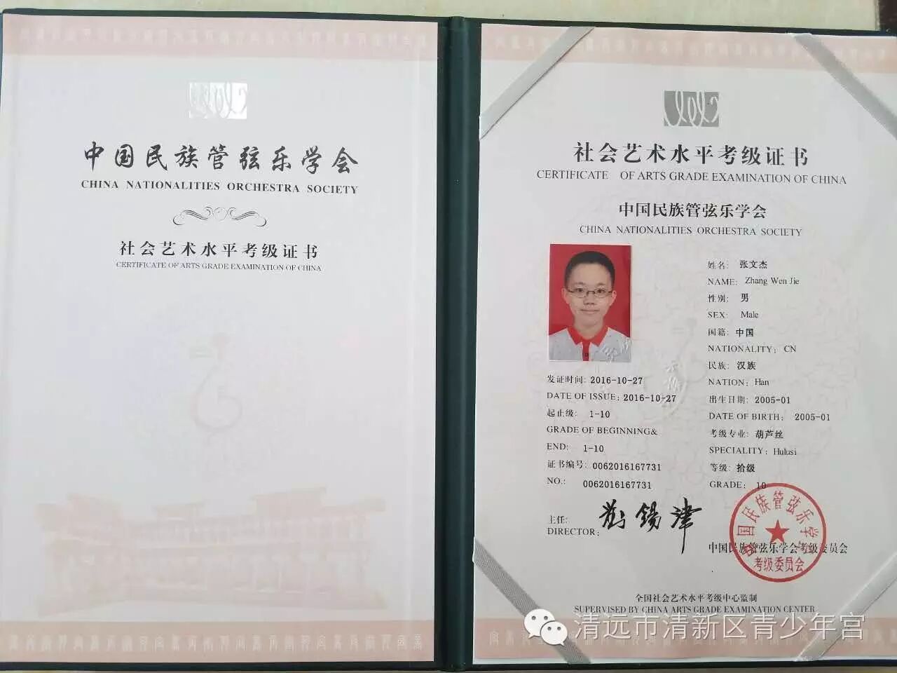 2016年11月19日,清新区青少年宫“爱*乐”葫芦丝公益乐队14名学员从张文邦主任手中接过由中国民族管弦乐学会颁发的社会艺术水平考级十级证书。