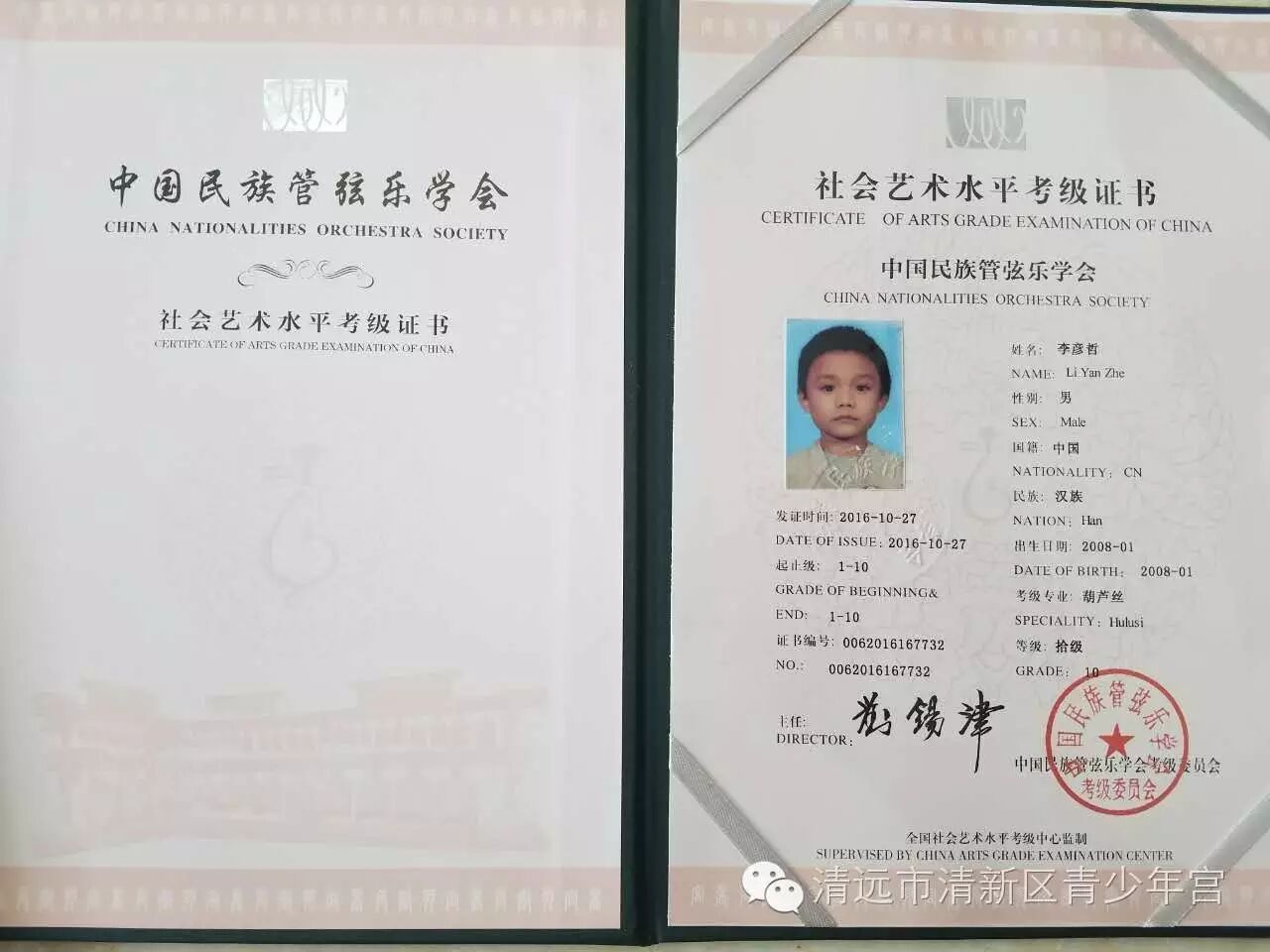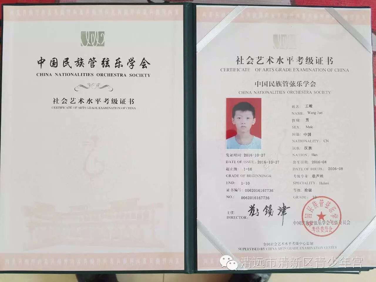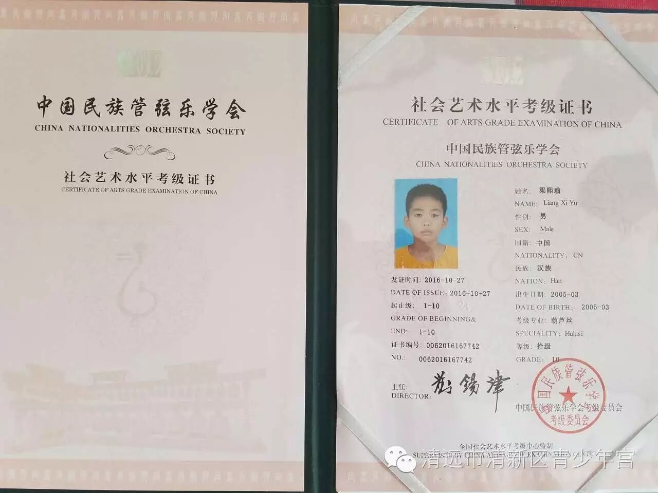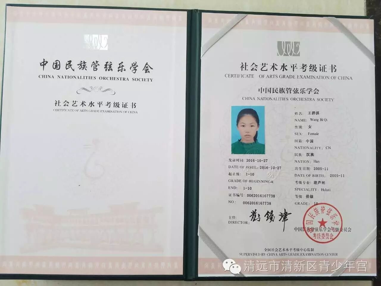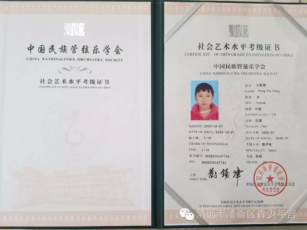 2016年11月19日,清新区青少年宫“爱*乐”葫芦丝公益乐队14名学员从张文邦主任手中接过由中国民族管弦乐学会颁发的社会艺术水平考级十级证书。