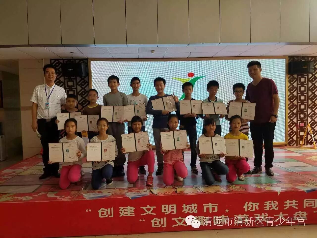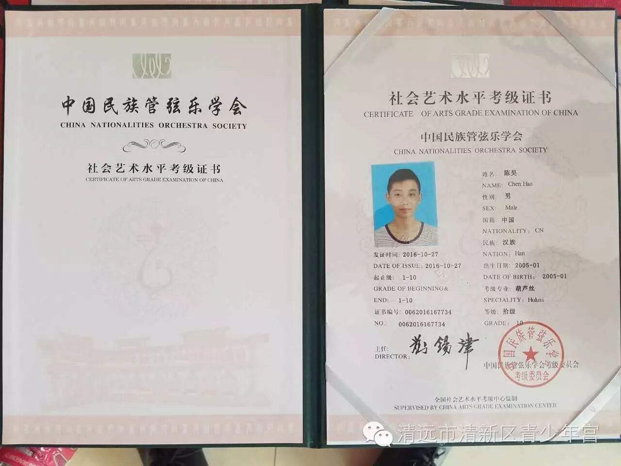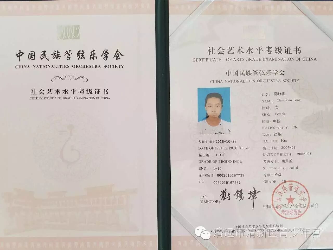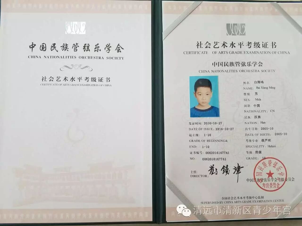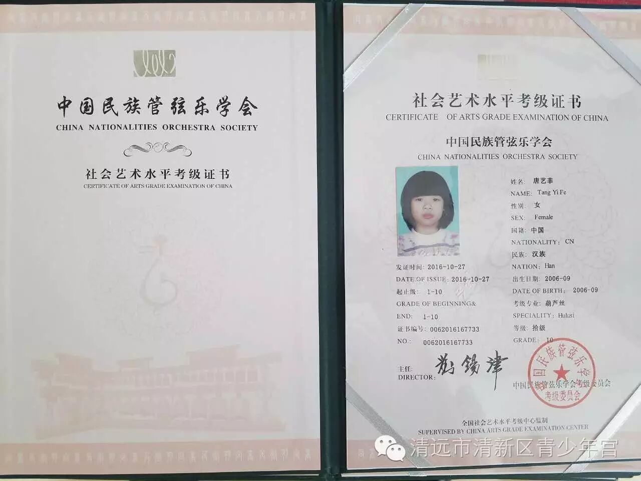 2016年11月19日,清新区青少年宫“爱*乐”葫芦丝公益乐队14名学员从张文邦主任手中接过由中国民族管弦乐学会颁发的社会艺术水平考级十级证书。