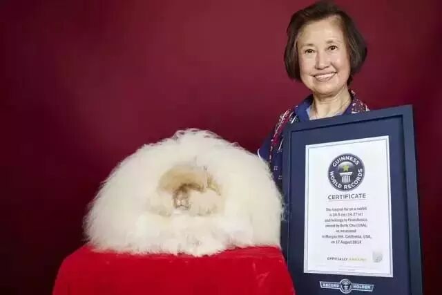 来自美国加利福尼亚州两岁的安哥拉兔Franchesca,经测量,其身上的毛发长度为36.5厘米,成功刷新纪录。他的主人是来自美国的Dr. Betty Chu,是一名研究英国安哥拉兔的专家。这种兔子经常会被人们误认为是哈巴狗,并且特别需要精心的照料。
