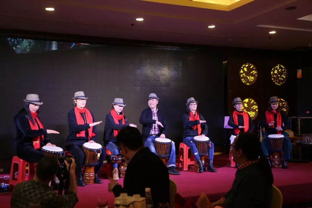 ▲二期学员的非洲鼓表演,拉开了节目表演的序幕。这些学员都是从零基础现学非洲鼓的。年会所有节目都由蓝巷子师生自编自演。