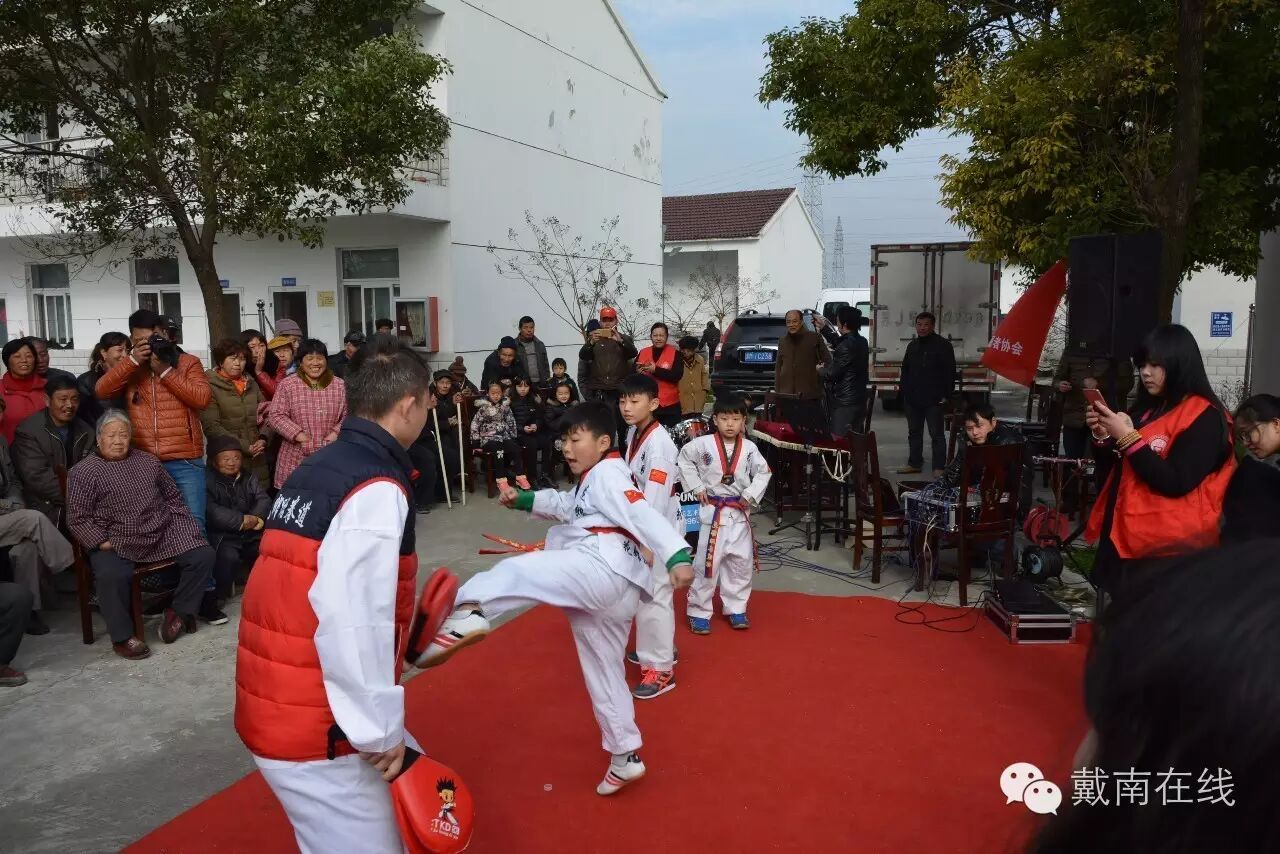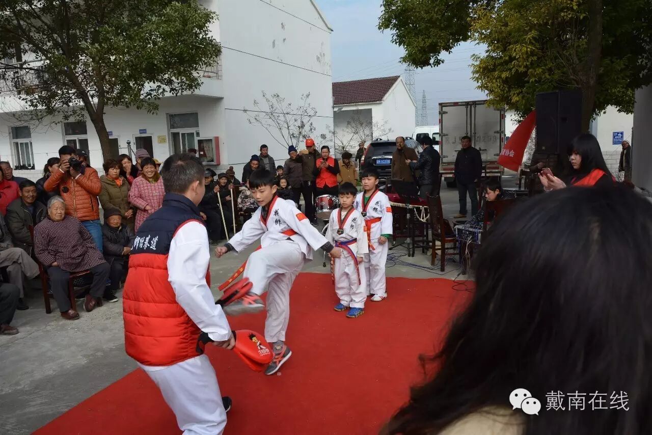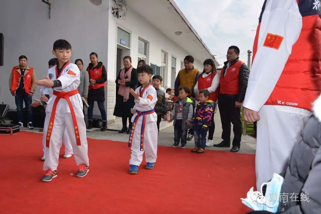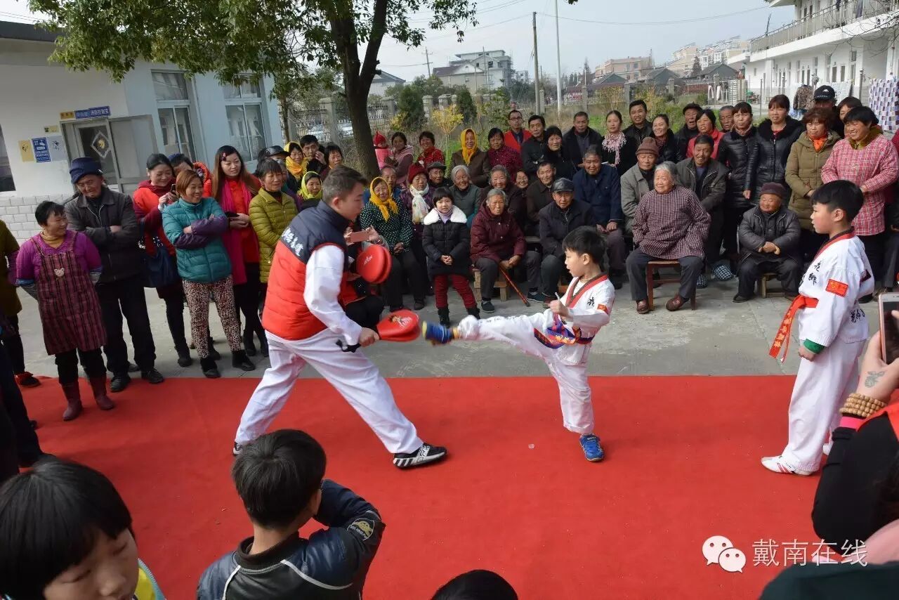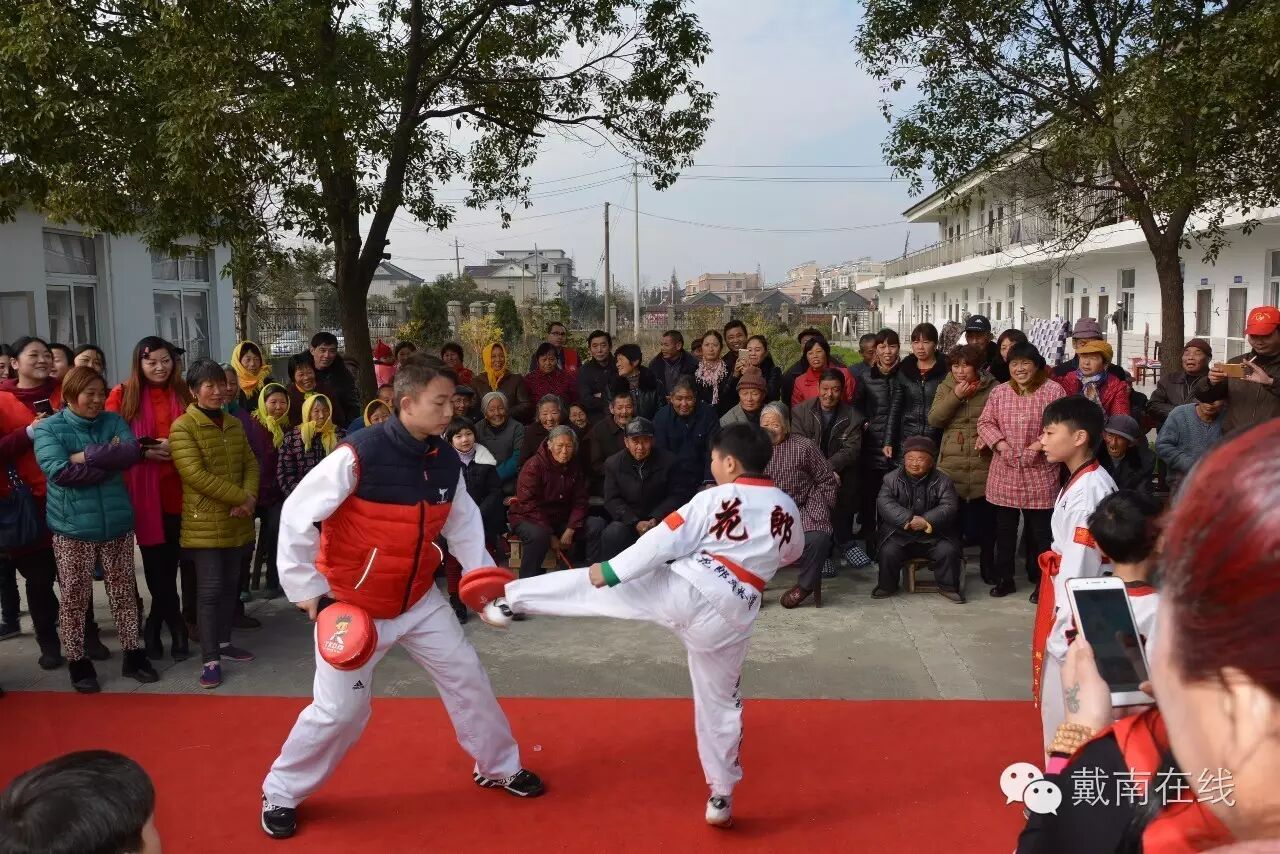 戴南花郎跆拳道的教练带着他们的学生在为老人表演