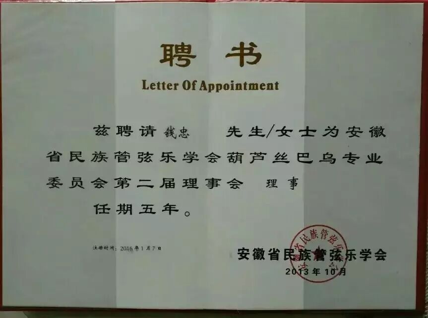 三、安徽省管弦乐学会葫芦丝巴乌专业委员会理事