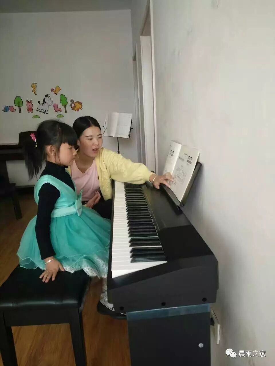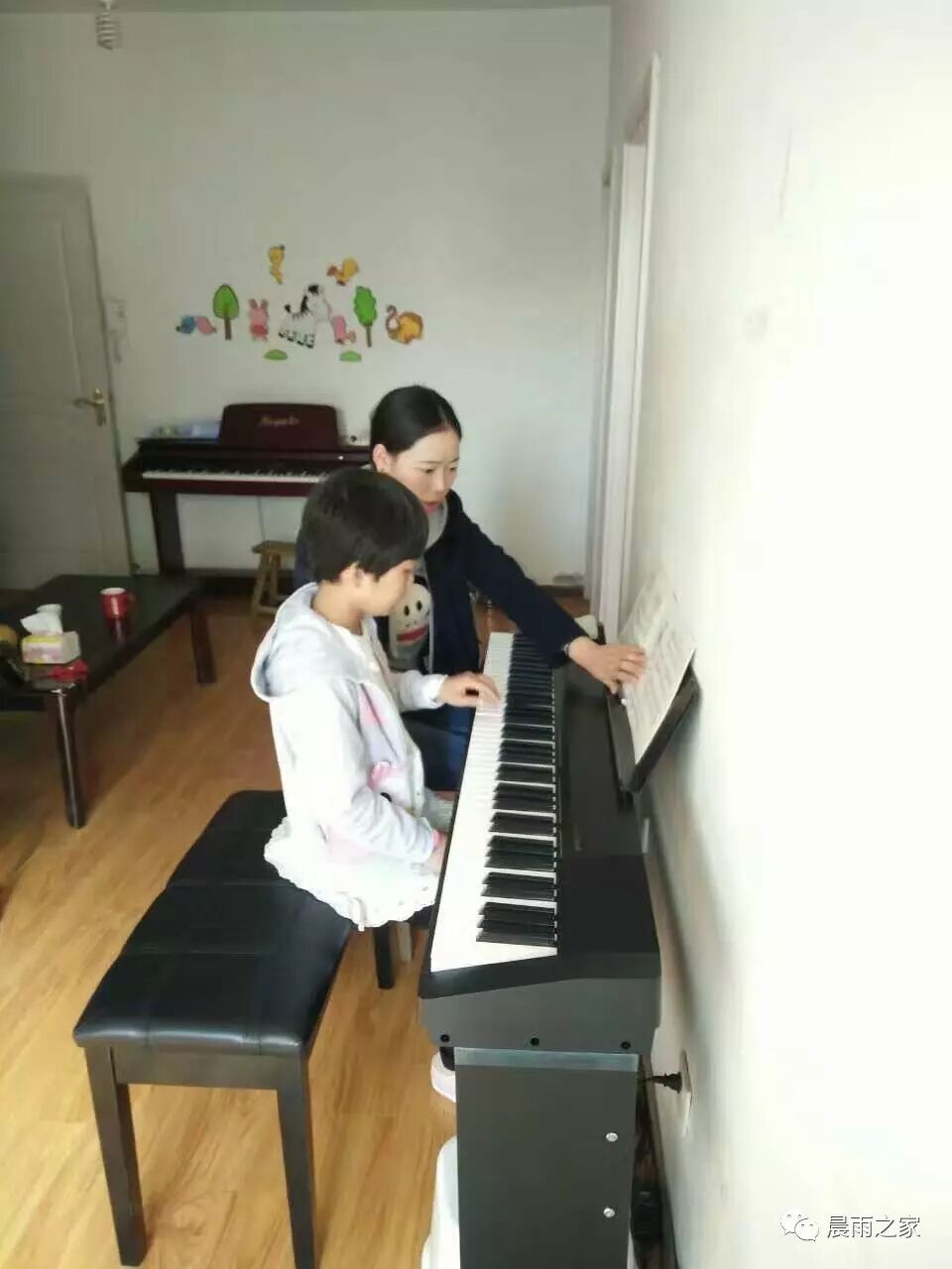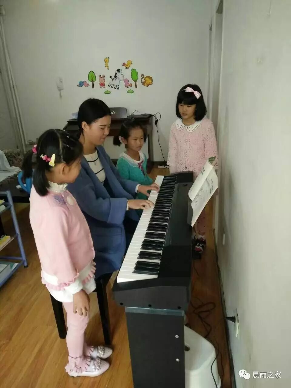 馨雅音乐学习班的刘老师和小孩们一起学习钢琴。