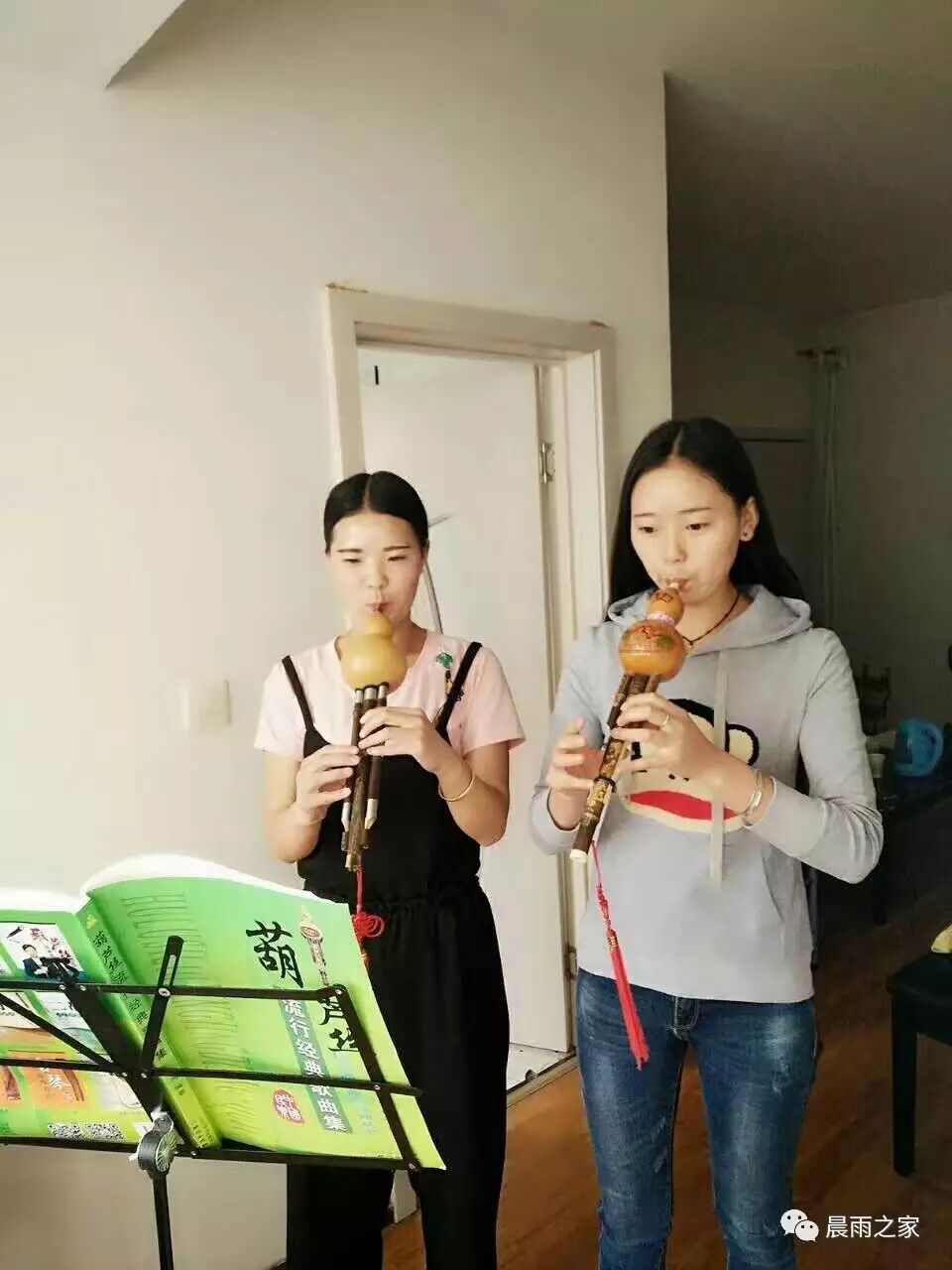 馨雅音乐学习班的郭老师和刘老师一起用葫芦丝演奏。