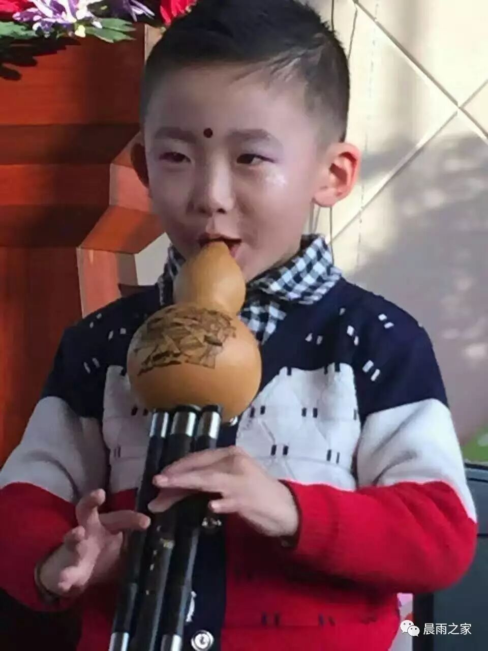 馨雅音乐学习班的孩子在汇报演出会上用葫芦丝吹奏。他把音乐奏成童年的美好,老师的成就,家庭的温暖。