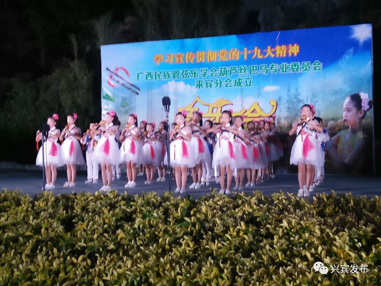 11月3日晚8点,该校学生受邀荣幸参加了学习宣传贯彻党的十九大精神,广西民族管弦乐学会葫芦丝巴乌专业委员会来宾分会成立的演出,一曲《金孔雀轻轻跳+山歌好比春江水》的精彩演出让观众印象深刻,掌声不断,也展示了我校学生良好的音乐素养及风采。
