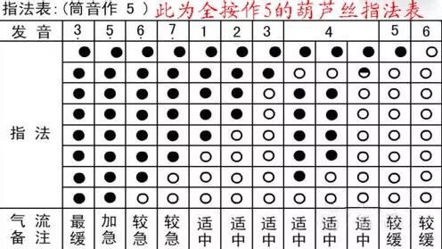 第二步,初学者要重视指法的练习,一般初次接触葫芦丝和笛子一样,以全按作5为起步指法,也就是把所有音孔都按住了,发音从“5(suo)”开始,一般练熟一个指发表差不多一小时应该可以。下图为全按作低音5的指发表。