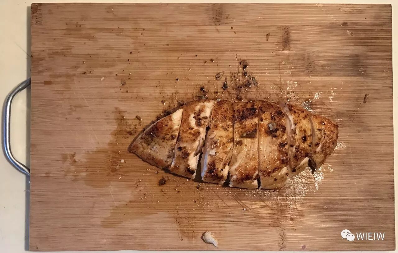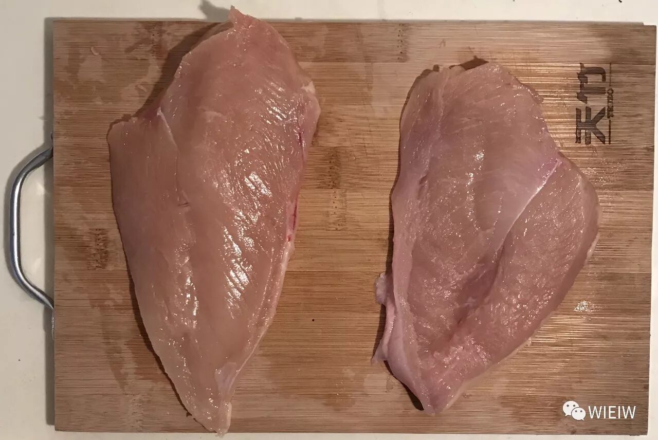 -鸡胸肉:将每个横着从中间切成两片,因为鸡胸肉很厚,中间不容易煎熟(生擒一定不能生吃)每片肉正反面撒盐,黑胡椒末,烟熏辣椒粉。