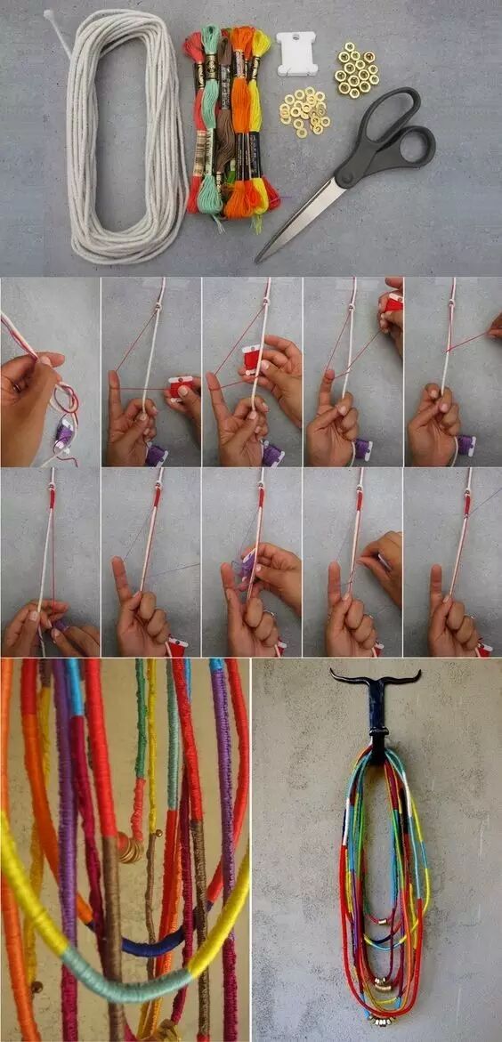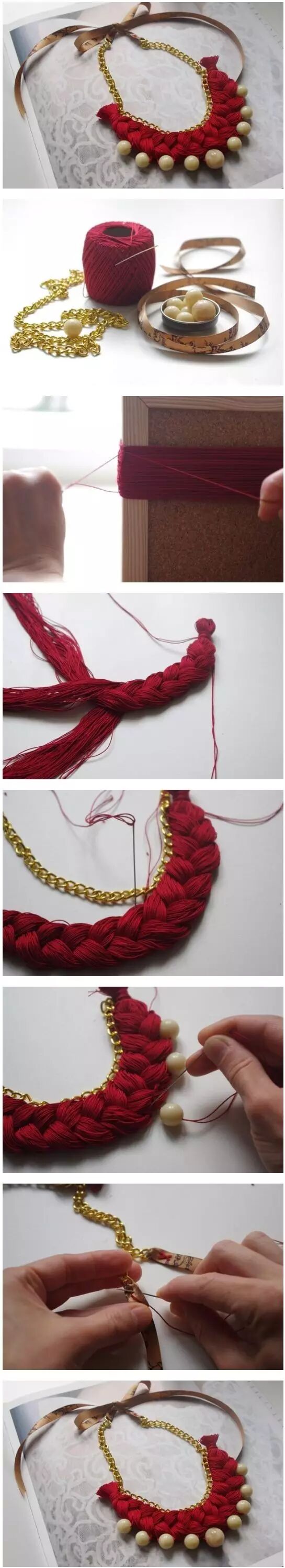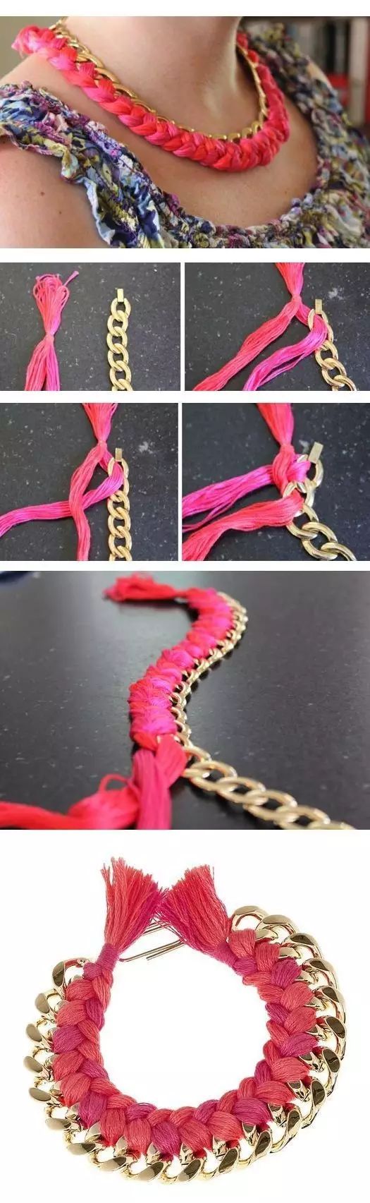 一条棉绳,用绣线一圈圈编织,缠绕包裹住。变身项链