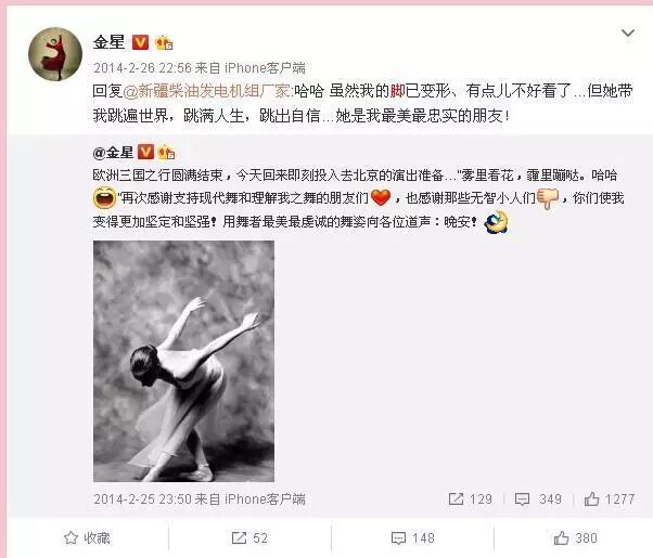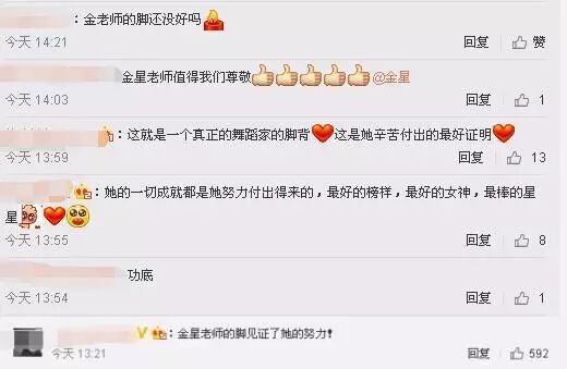 虽然金星现在看起来主要是在做主持人,《金星秀》也是很受大家欢迎。不过她之前是一位舞蹈家,而且她对自己的身份定位不是主持人而是舞蹈家。很多网友也表示,金星的脚见证了她的努力。