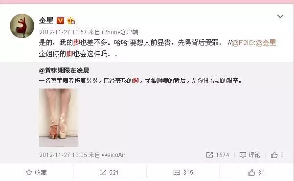 有网友问金星,金姐的脚是不是也会这样?金星则是回复说她自己的脚和图片上的脚也差不多,想要人前显贵就要现在背后受罪。