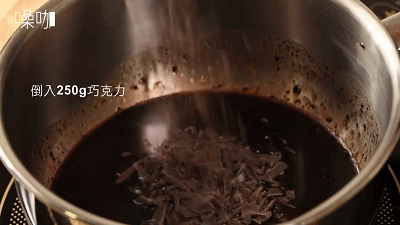 ☑ 继续倒入250克巧克力,4勺花生酱,均匀搅拌。