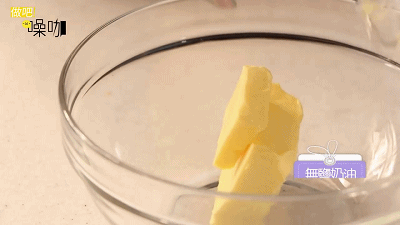 ☑ 在容器中放入110克无盐奶油,倒入糊状糖浆,搅拌;
