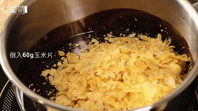 ☑ 倒入60克玉米片,搅拌;然后倒入60克碎榛果,继续均匀搅拌。