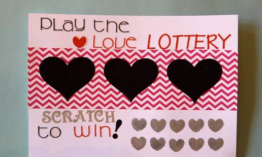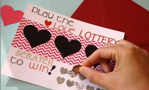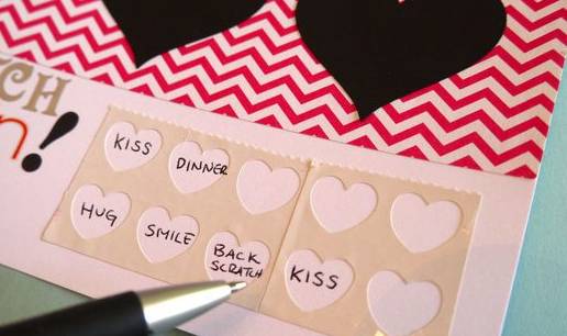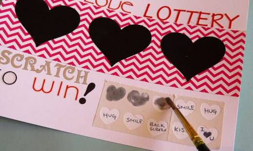 接下来做彩票划掉的部分,使镂空的心形的贴纸标签纸模板作为你的卡片模板。用钢笔或者圆珠笔写上你的话,如图,你可以任意设置奖品,一个拥抱,一个吻,一个微笑,或者你想说的话都可以。等待墨水干掉,开始下一步。