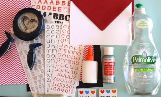,心形穿孔器。白色的胶水。剪刀,铅笔,钢笔、水性涂料,白色蜡笔和一个小画笔。