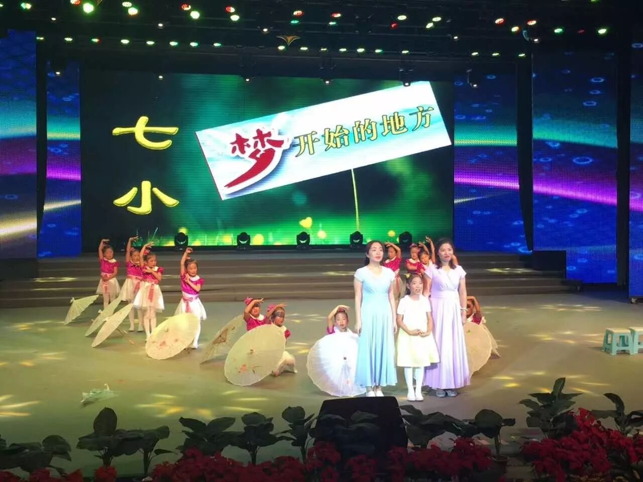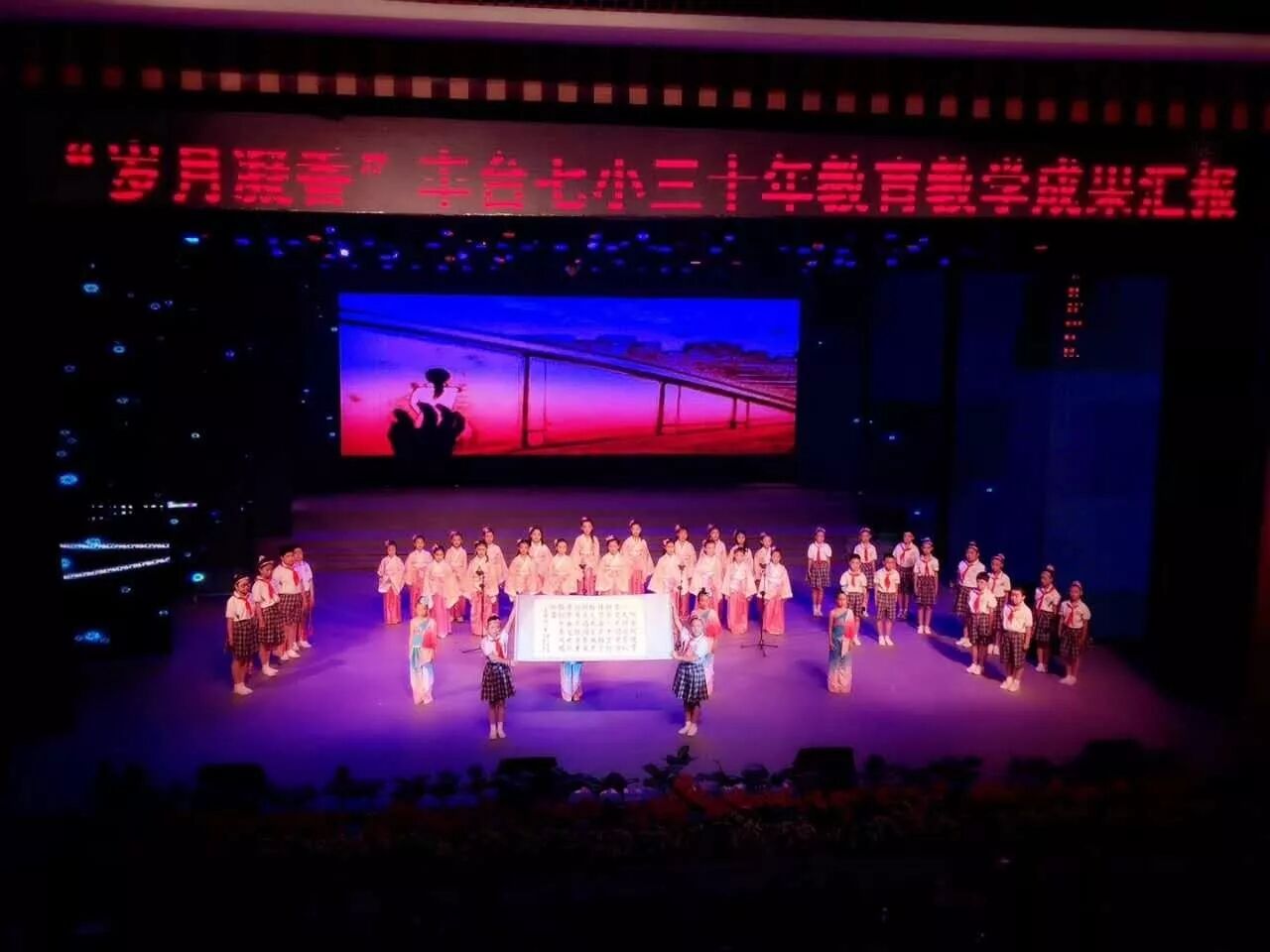 丰台七小校合唱队学生演唱的《萤火虫》和《校园多美好》拉开教育教学成果汇报展示的序幕。二、三年级学生表演音乐剧《梦开始的地方》和舞蹈《追梦》,表达了同学们对老师,对七小深深的敬爱之情。四、五年级学生用自己创作的诗词表达自己对七小建校30周年的喜悦与热爱。