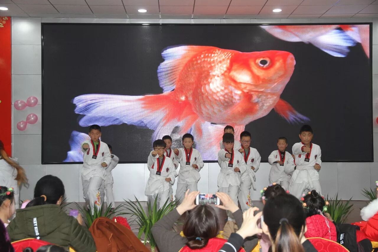 身穿白色跆拳道服的孩子们表演了动作性较强的跆拳道表演。