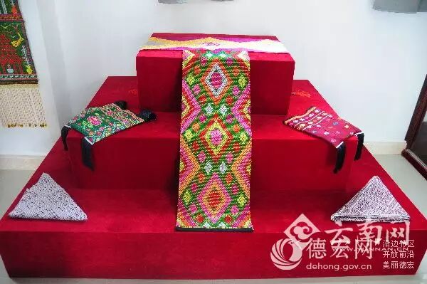 德宏处于古代南丝绸之路的必经之地,在开放的地理优势下,傣族织锦受到了蜀锦织造技艺的影响,吸取了蜀锦的高超技艺,形成了德宏地区傣族织锦的鲜明特色。。傣族织锦色彩浓厚艳丽,具有强烈的视觉冲击力,大量用红色、黄色、绿色等亮度、纯度较高以及饱和度较高的色彩来形成鲜明对比,以黑色和暗红色为底,在图案上加织以金、银丝线,极具异域风情。