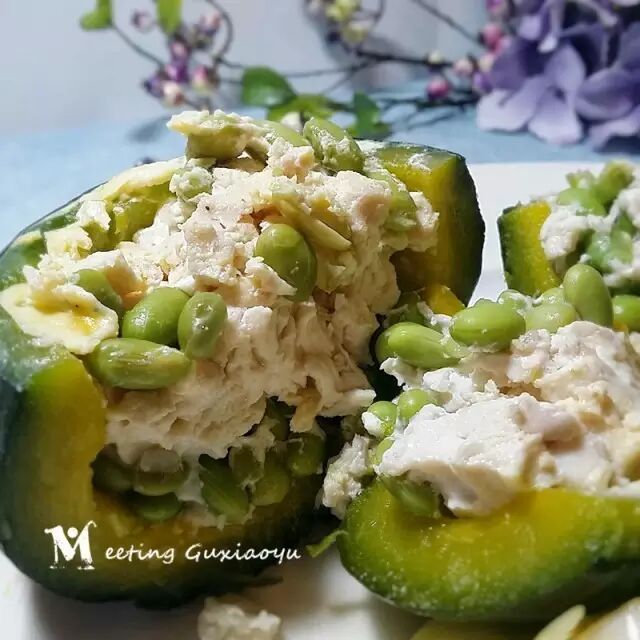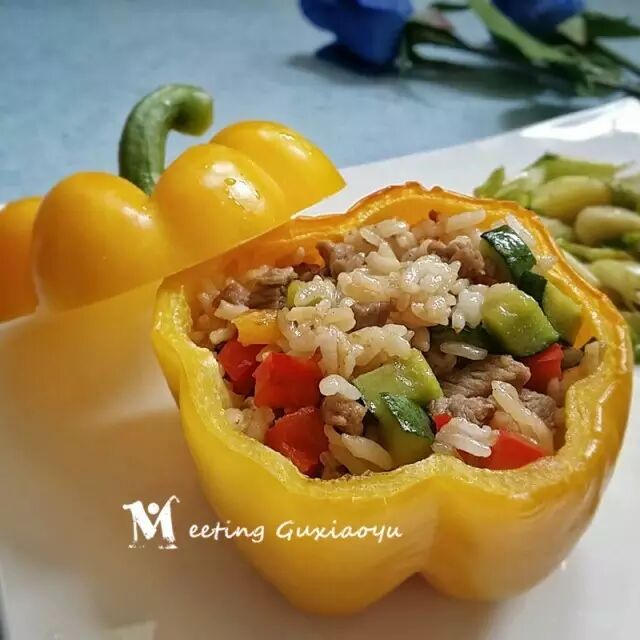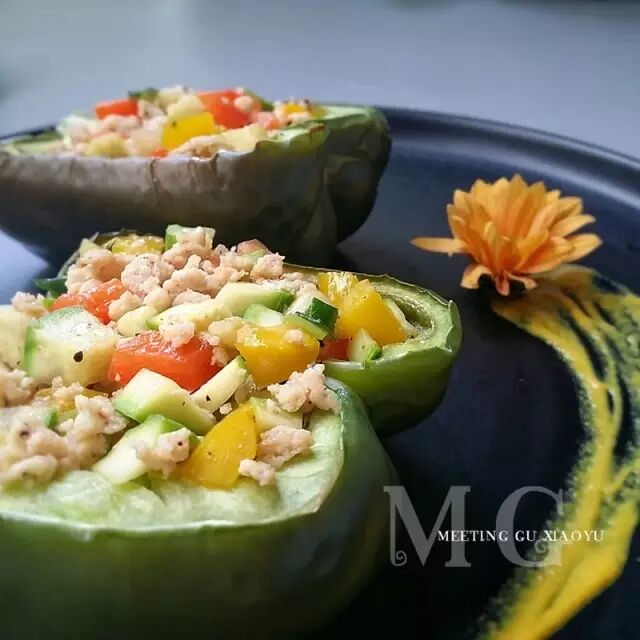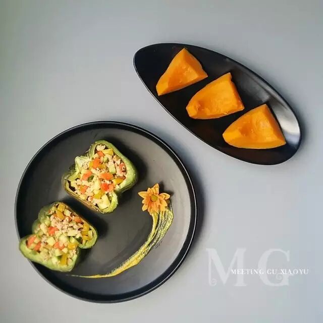 鸡胸肉杂蔬烤青椒+蒸南瓜